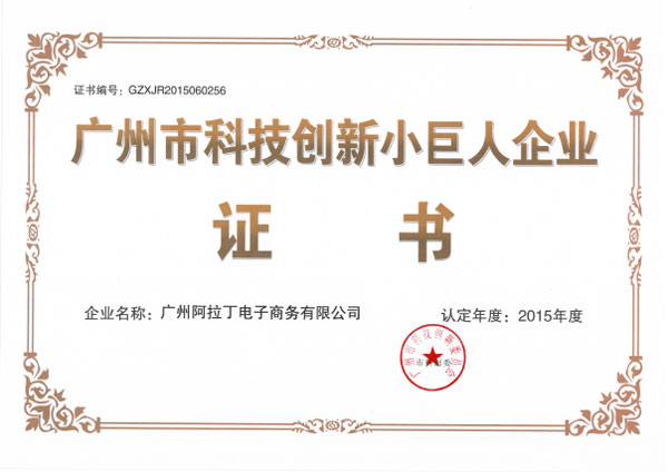 作為一家高新技術型企業,廣州阿拉丁電子商務公司滿足廣州市科技創新小巨人企業庫入庫條件,并榮獲由廣州市科技創新委員會頒發的2015年度“廣州市科技創新小巨人企業”證書。