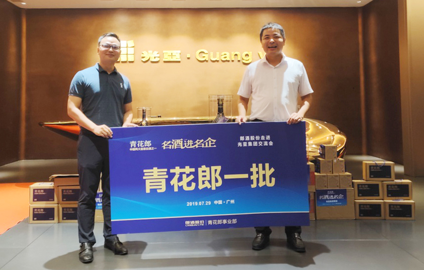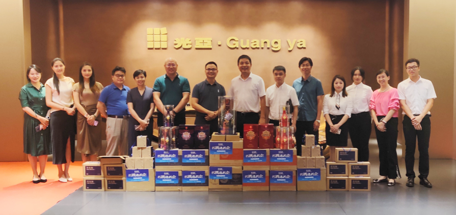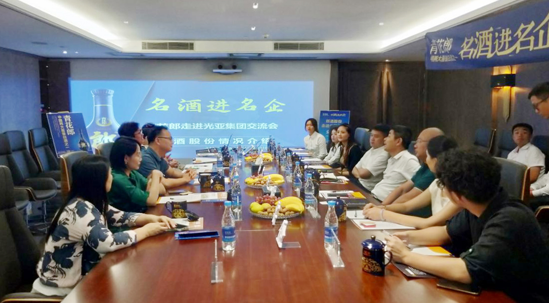 7月29日,四川古藺郎酒股份高層參訪光亞集團總部,開展“名酒進名企”座談會及贈酒活動,光亞集團董事程云、光亞研究院副院長葛國華、阿拉丁神燈獎組委會秘書長鄭雅琴、集團品牌文化部部長張文良、董事長助理吳婕等熱情接待了郎酒股份高層。