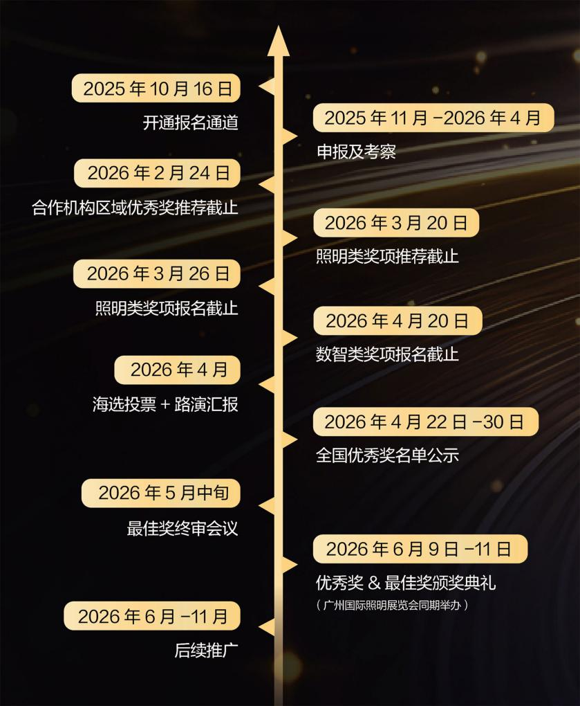 照明產品獎:①供應鏈 ②家居照明 ③舞臺演藝設備 ④商業照明 ⑤景觀照明 ⑥道路照明 ⑦工業照明 ⑧特殊照明 ⑨管理控制系統